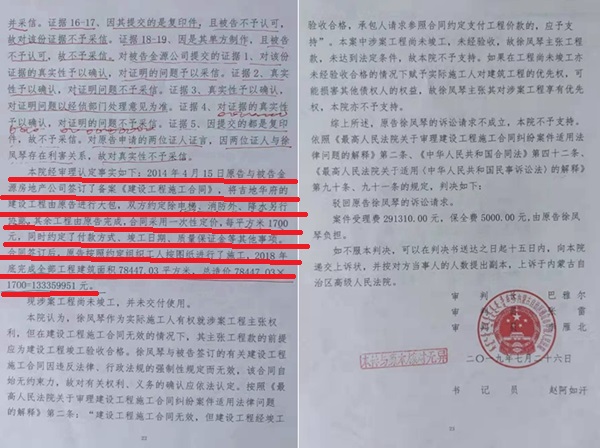 据通辽市中级法院判决书记载:为了讨还工程款,徐凤琴曾就案涉工程多次起诉过国君公司、金源地产和淇奥公司。通辽市中级法院于2019年7月26日作出的(2019)内05民初20号民事判决书,明确了本案原告徐凤琴作为实际施工人有权就案涉工程主张权利,吉地华府工程造价为每平米1700元人民币,但因被告拒绝提交竣工报告和验收合格证明,她的诉讼请求被法院驳回,又给她造成460970元的经济损失。