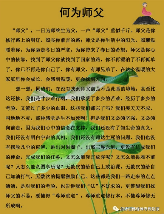 特别提醒:古语云“师徒如父子,一日为师,终身为父”,父母给予我们生命,老师给予我们慧命,如果您决定拜师,请细读下面对师父的略解,拜师也要顺其一“缘”字。不见得所有报名学员都能拜释延振师傅为师,师傅也要有所选拔,是否具有感恩之心,是否懂得尊师重道········