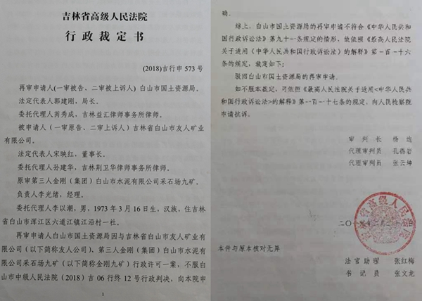 2018年,赵珉(友人矿业)伪造白山市安监局 2015.1号文件公章、金刚集团白山水泥有限公司红头文件及公章,以坐标点重叠为由,把我金刚九矿与白山市国土资源局起诉到白山市浑江区法院。白山市浑江区国土资源局、白山市安监局、白山水泥有限公司及采石场九矿均出具书证证明赵珉手续均系伪造。但是,在白山市中级法院常务院长吕健(赵珉的亲姐夫)运作下,浑江区法院在2018年1月31日居然判假手续胜诉!赵珉(友人矿业)在区法院胜诉后,又上诉到白山市中级法院,要求法院撤销我金刚九矿的采矿许可证。在赵珉亲姐夫吕健安排下,白山市中级法院2018 年6 月12日又一次支持了赵珉的所谓合法权益,撤销了采石场九矿招牌挂办理的合法手续。采石场九矿与白山市浑江区国土资源局在2018 年12月10日向吉林省高级人民法院提起申诉,在赵珉亲姐夫吕健精心安排下,吉林省高级人民法院于2019年2月28日再一次维护了赵珉的所谓合法权益。